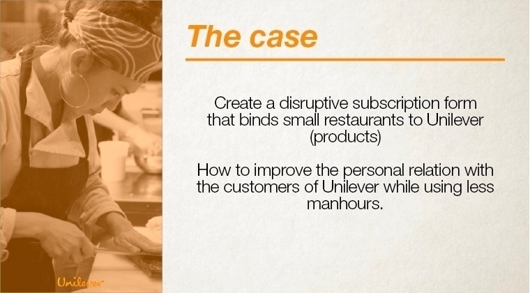A project where we had to create a concept for their plans to start a subscription plan for restaurants. The assignment was to cut out the middleman and let restaurants buy their products directly from Unilever instead of the wholesale.