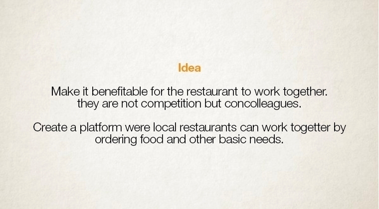 The concept we came up with makes use of the realisation that all the restaurants buy food separately but when buying in together the price drops.