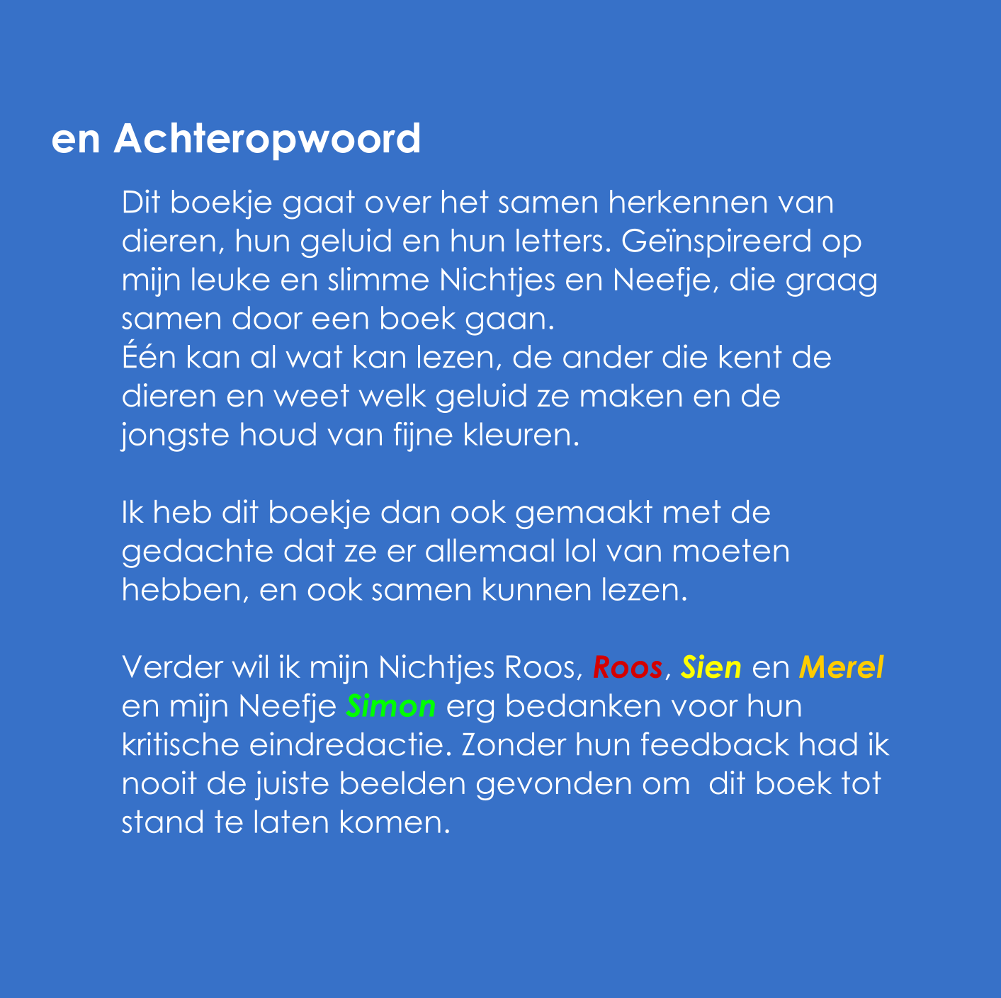 A fun Dutch book designed for children aged 0 to 6. It is fun for multiple age groups. Younger children can simply recognize the animals, while older ones will be challenged to read the animal’s name and find the letters within the animal itself.